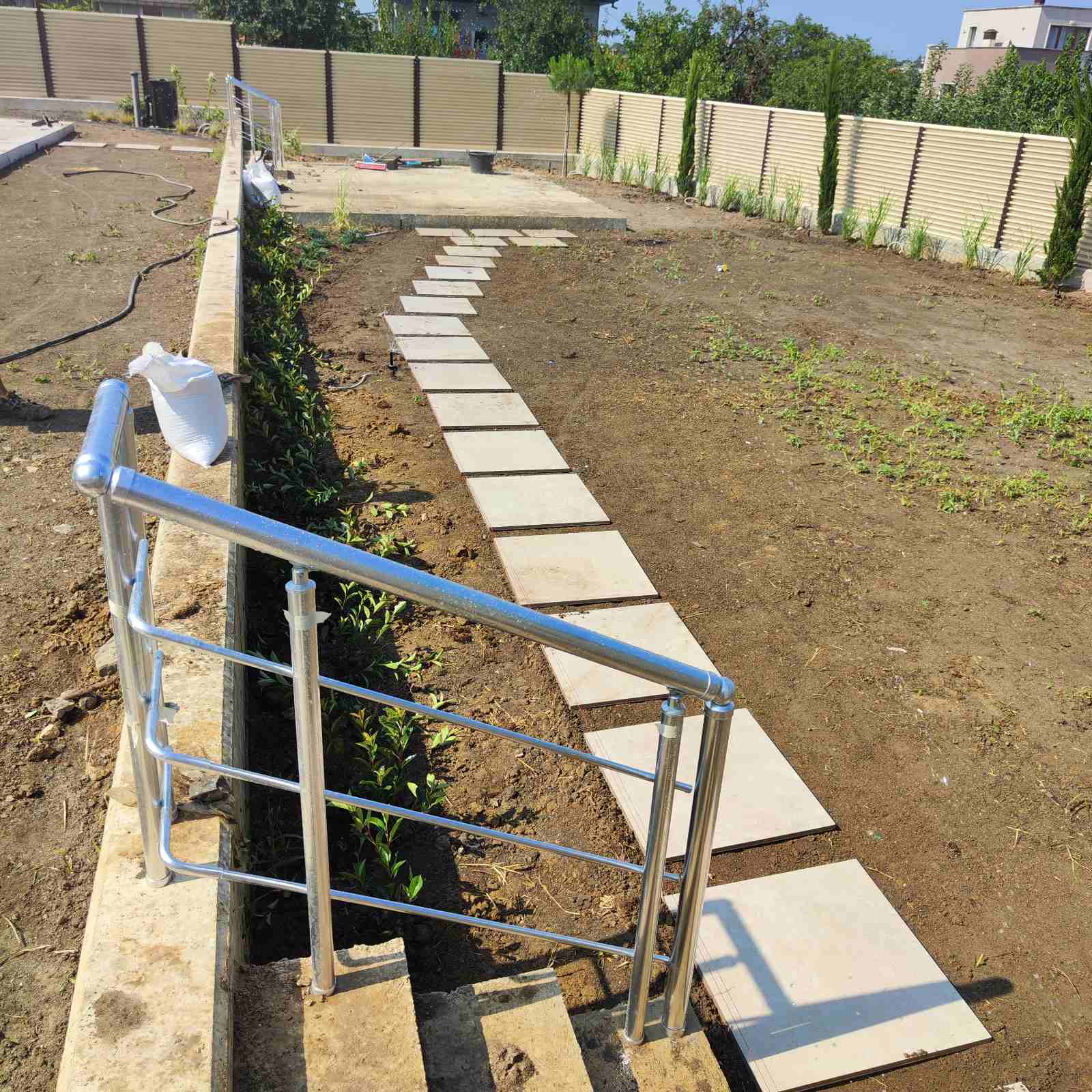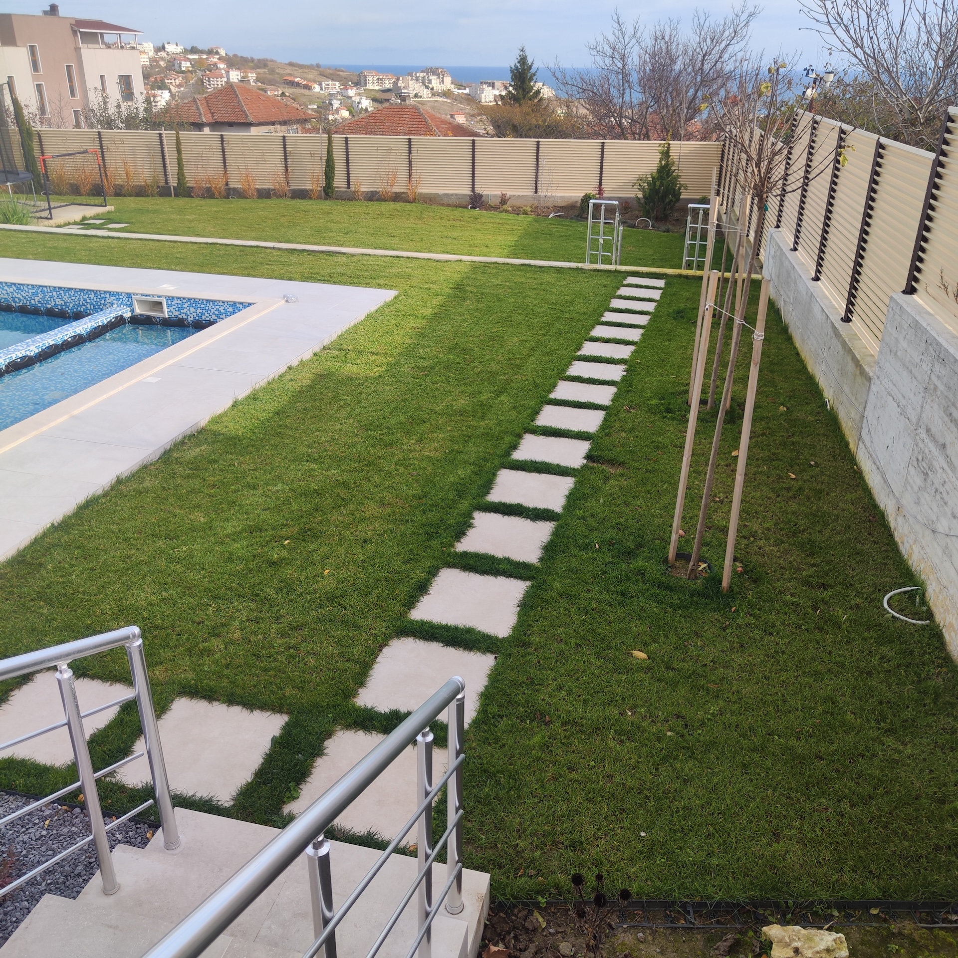 Клиентът се спря на нас да направим проекти за озеленяване и поливна система. Тук направихме и вертикалната планировка , която беше доста особена заради терасирането и тесните ивици , което затруднява механизацита. Огромен проблем беше , че работихме лятото , при температури около 35 градуса. След изграждането на поливната система нещата станаха по - леки. Използвахме тревен чим , защото клиента искаше мигновен резултат. Хвърлихме изключително много усилия , но крайния резултат е отличен.